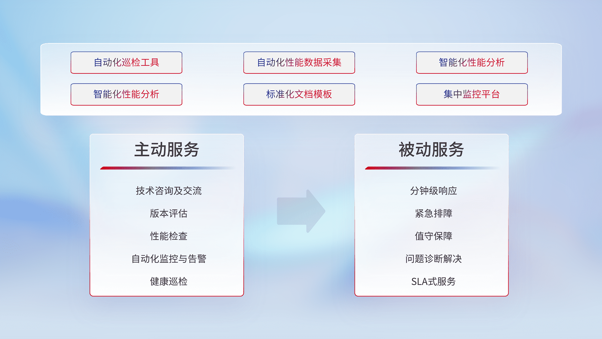 智能化工具和标准化文档,,,,保障服务质量,,,提供主动服务(包含技术咨询、、版本评估、、性能检查、、自动化监控与告警、、、、健康巡检)和被动服务包含(分钟级响应、、紧急排障、、、、值守保障、、问题诊断解决、、SLA服务)。。