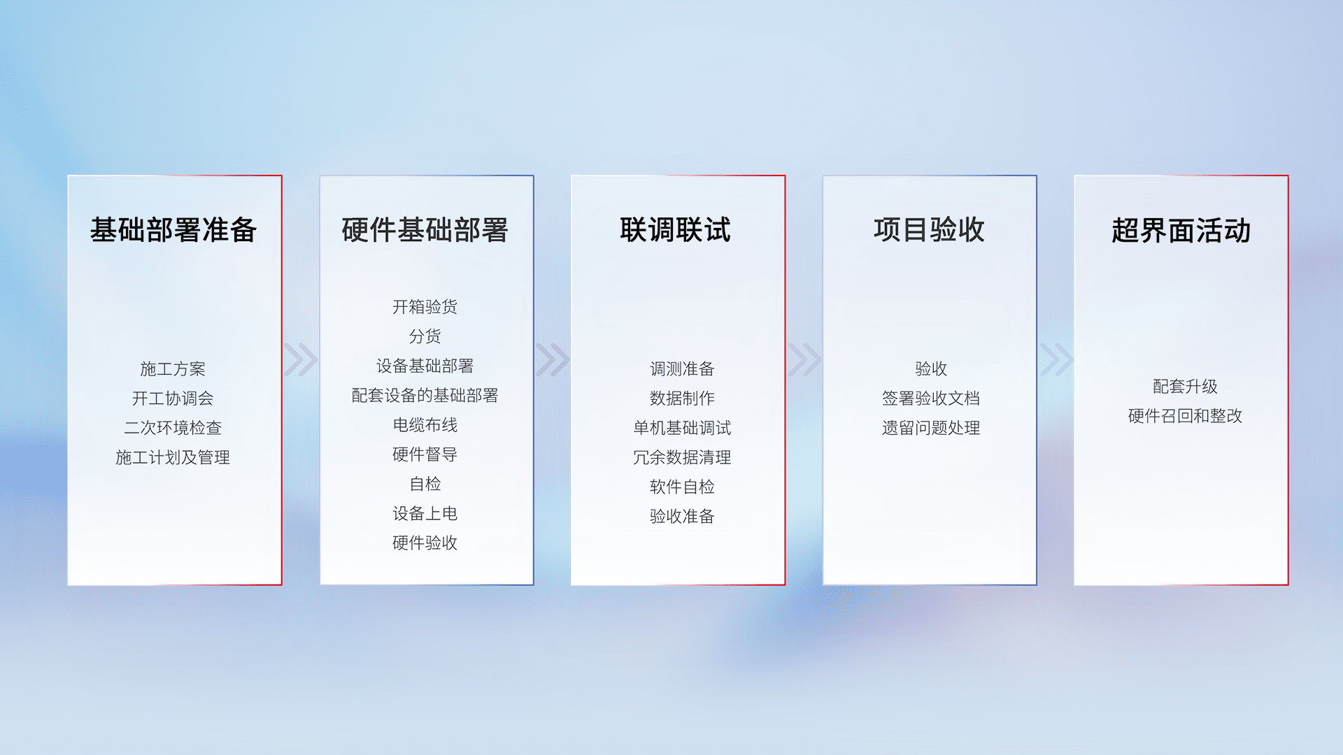 从基础部署准备、、、、硬件基础部署、、、、联调联试、、、、项目验收、、、越界面活动的全过程可追溯,,,保证施工质量和进度。。