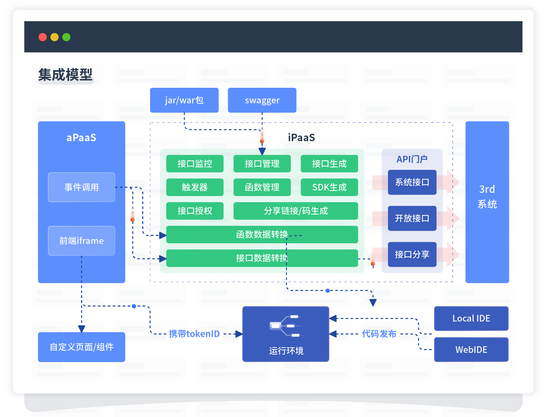 集成模型包括平台本身前、、、、、、、、后端能力的扩展,,,,,,,,,,,,也支持通过API门户和第三方系统进行交互。。。。。。