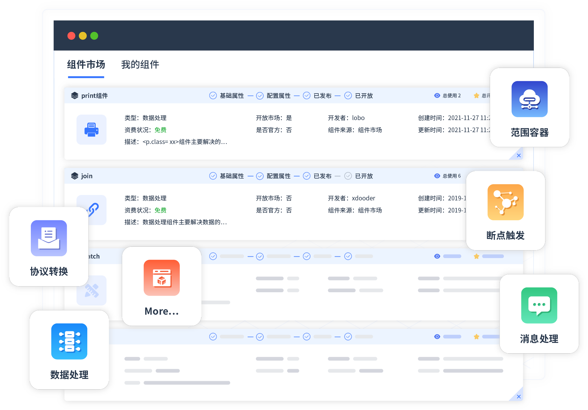 针对集成场景,,,,,NO钱包提供组件市场,,,,,,例如协议转换、、、、、、、、、、、消息处理、、、、、、文件操作等。。。。。。。。除平台提供的组件外,,,,,,客户可以自定义所需组件。。。。。。。