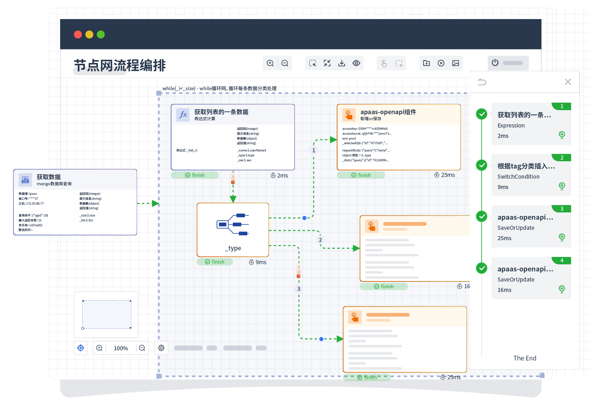 针对集成场景,,,,,,,,,,,组件定义后支持进行流程编制,,,,,,不同于传统代码方式,,,,通过图形化展示,,,,,,,,,,,,,支持在线调试、、、、、、、、、、、、日志查看和运行回放。。。。。。。。。。。。。