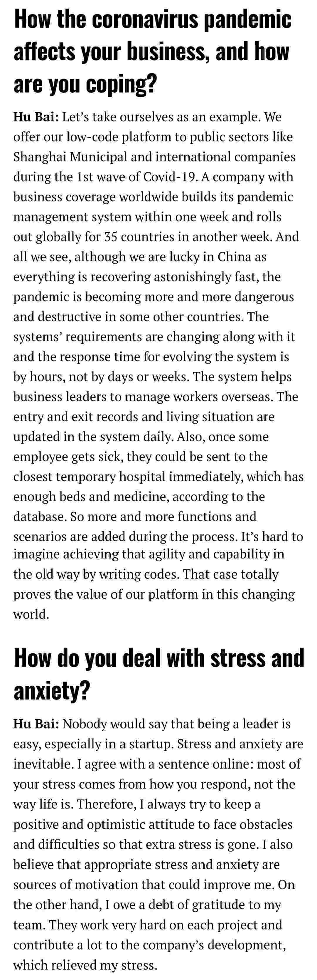 2021年年初,,,,爱湃斯科技CEO胡柏受邀接受法媒Startup.info的专访,,,,,,,与Startup info的读者分享了自己的创业经历、、、、、以及低代码平台NO钱包的创新之处。。。。。。。